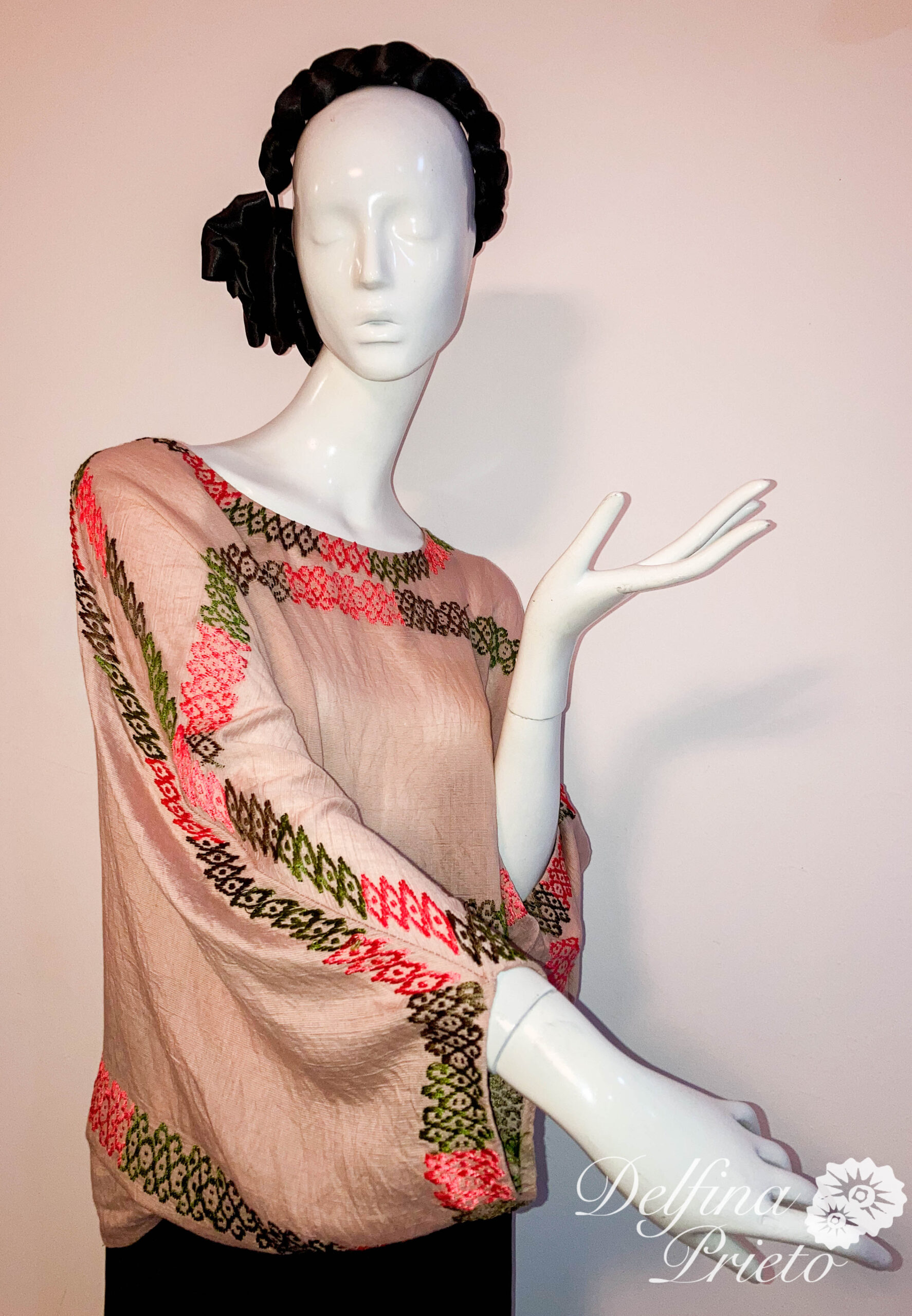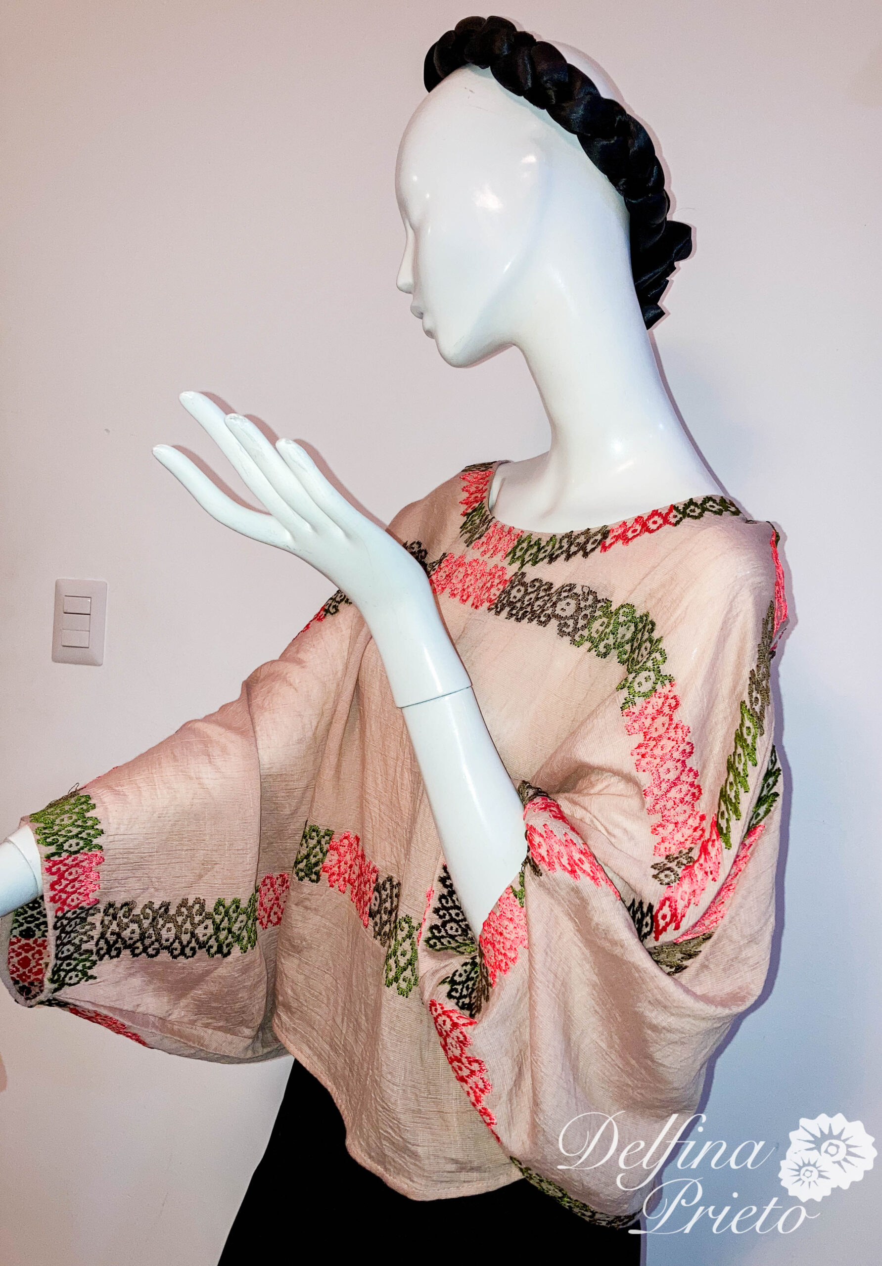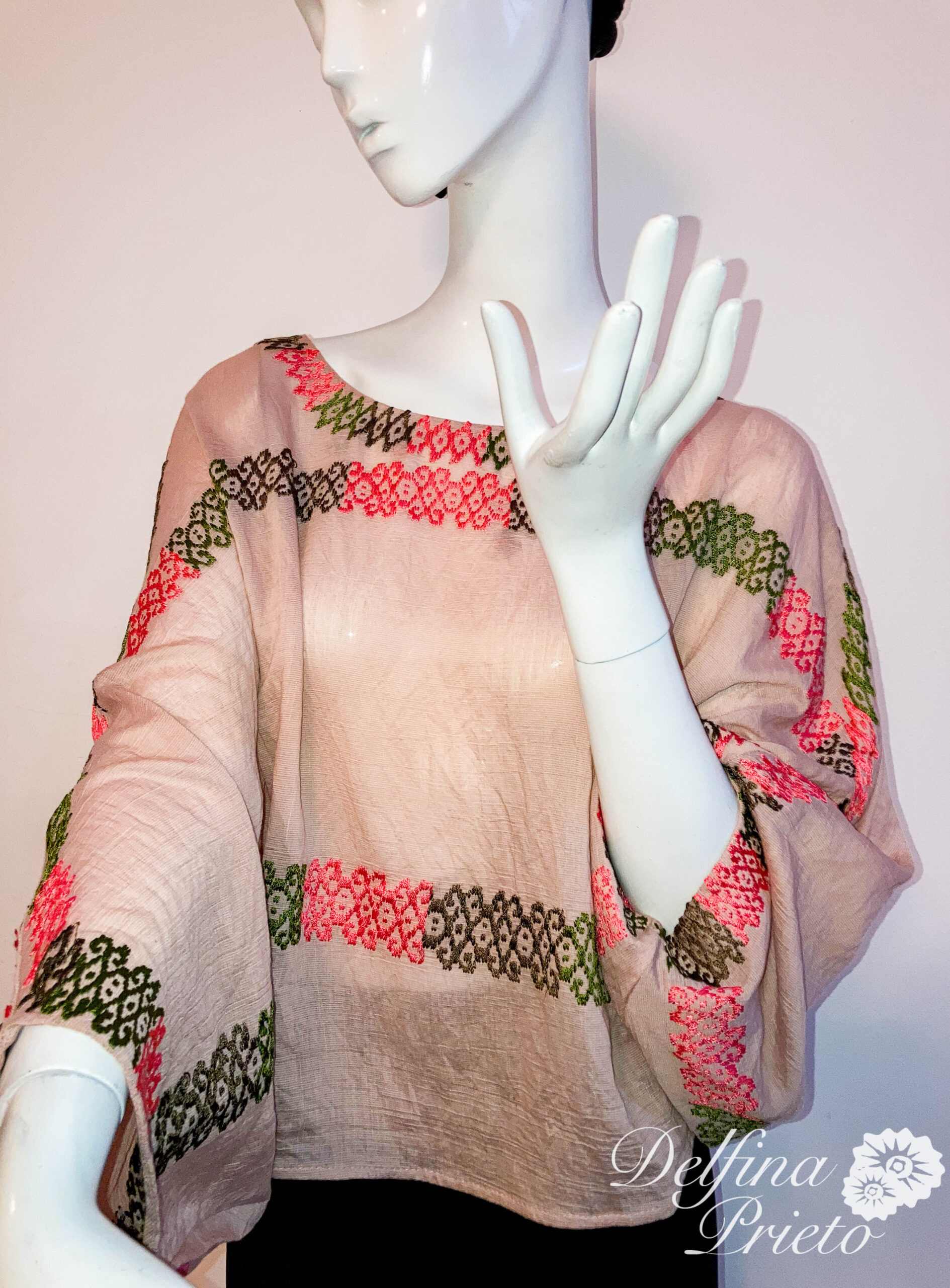 Blusa étnica hexagonal, diseñado sobre la pieza con motivo original del huipil de San Lucas Ojitlan,  con hilo de algodón en varios colores.
